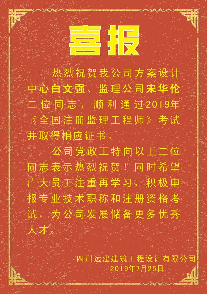 公司二同志通过全国注册监理工程师考试喜报